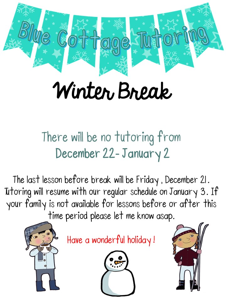 UncategorizedVacation November 25, 2018January 23, 2019 bluecottagetutor Winter Break Schedule for tutoring Share this: Click to share on X (Opens in new window) X Click to share on Facebook (Opens in new window) Facebook More Click to share on Pinterest (Opens in new window) Pinterest Like Loading... Related Published by bluecottagetutor I'm a mom, grandma, and teacher. I've been a reading tutor for over 20 years. View all posts by bluecottagetutor